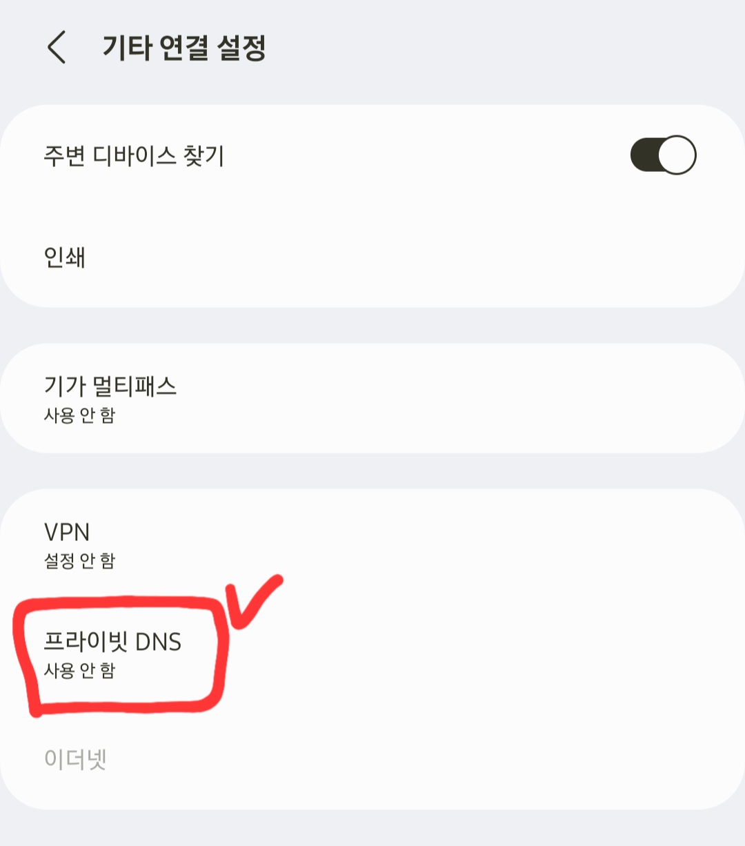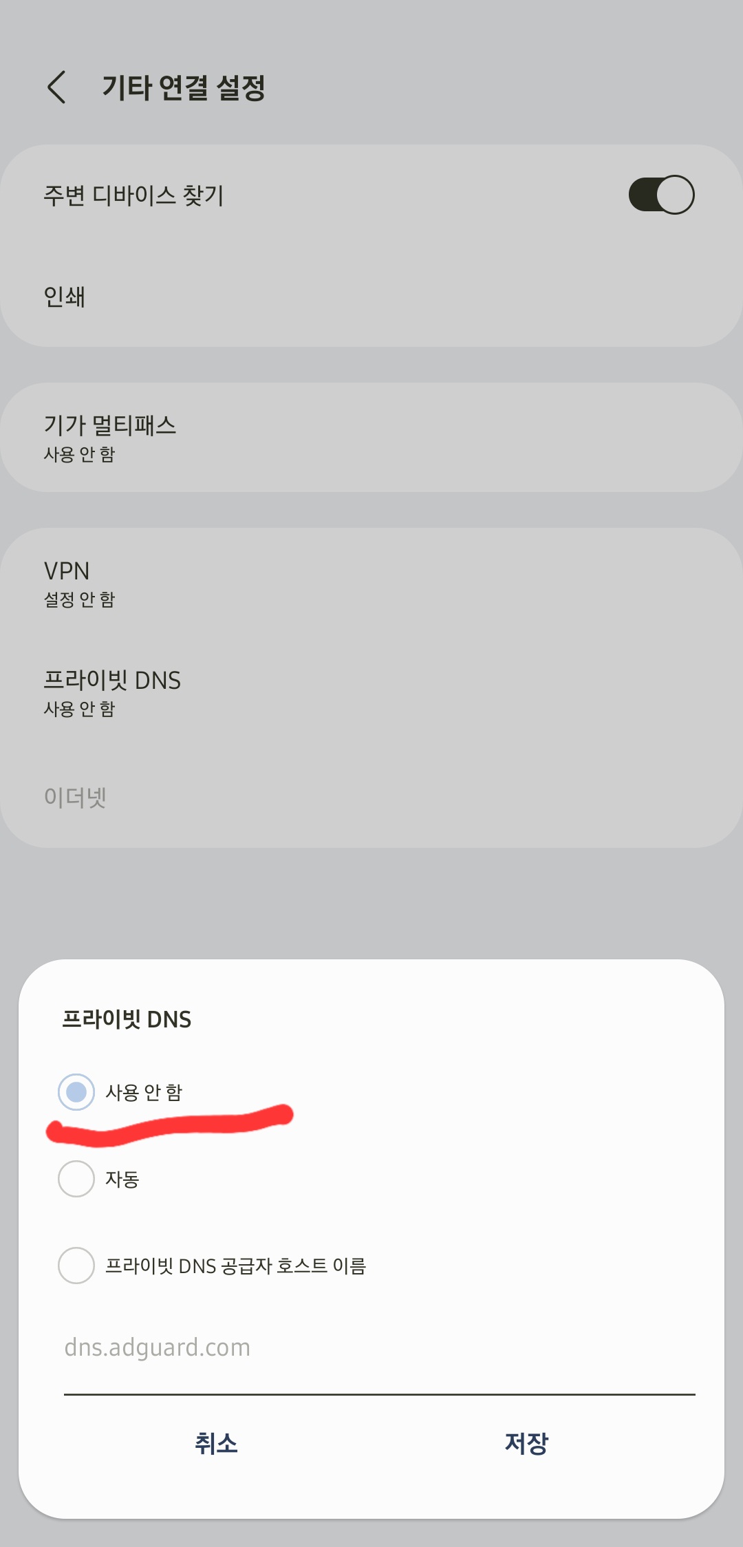 사용 안 함을 [프라이빗 DNS 공급자 호스트 이름] 을 클릭 후